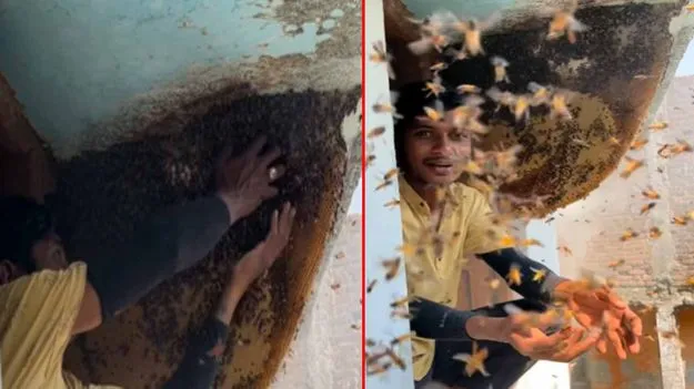 సోషల్ మీడియాలో ఓ వీడియో (Viral Video) తెగ వైరల్ అవుతోంది. ఓ యువకుడు పెద్ద తేనె తుట్ట (Honeycomb) వద్ద కూర్చుని ఎదురుగా ఫోన్ పెట్టి కెమెరా ఆన్ చేస్తాడు. ఆ తర్వాత ఏకంగా తన చేతులను తెను తుట్టలో పెడతాడు. అంతటితో ఆగకుండా తన రెండు చేతుల నిండా తేనెటీగలను పట్టుకుని కెమెరాకు చూపిస్తాడు.